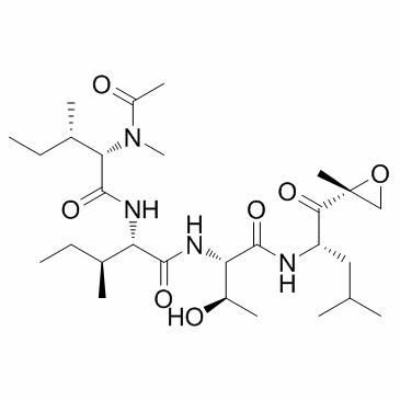 Epoxomicin is a selective proteasome inhibitor with anti-inflammatory activity, inhibits primarily the CH-L activity of the 20S proteasome, while T-L and PGPH catalytic activities are also inhibited at 100- and 1000-fold reduced ...
