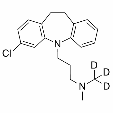 Clomipramine D3 is the deuterium labeled Clomipramine. Clomipramine is a serotonin transporter (SERT), norepinephrine transporter (NET) dopamine transporter (DAT) blocker with Kiof 0.14, 54 and 3nM, respectively.